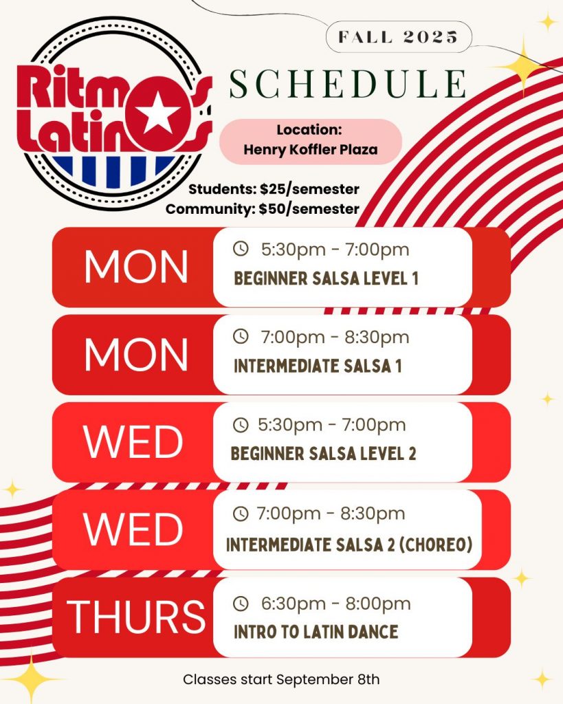 Classes will start on September, 8th with each class meeting their weekly times (specified below). Class locations will be at the Henry Koffler Plaza