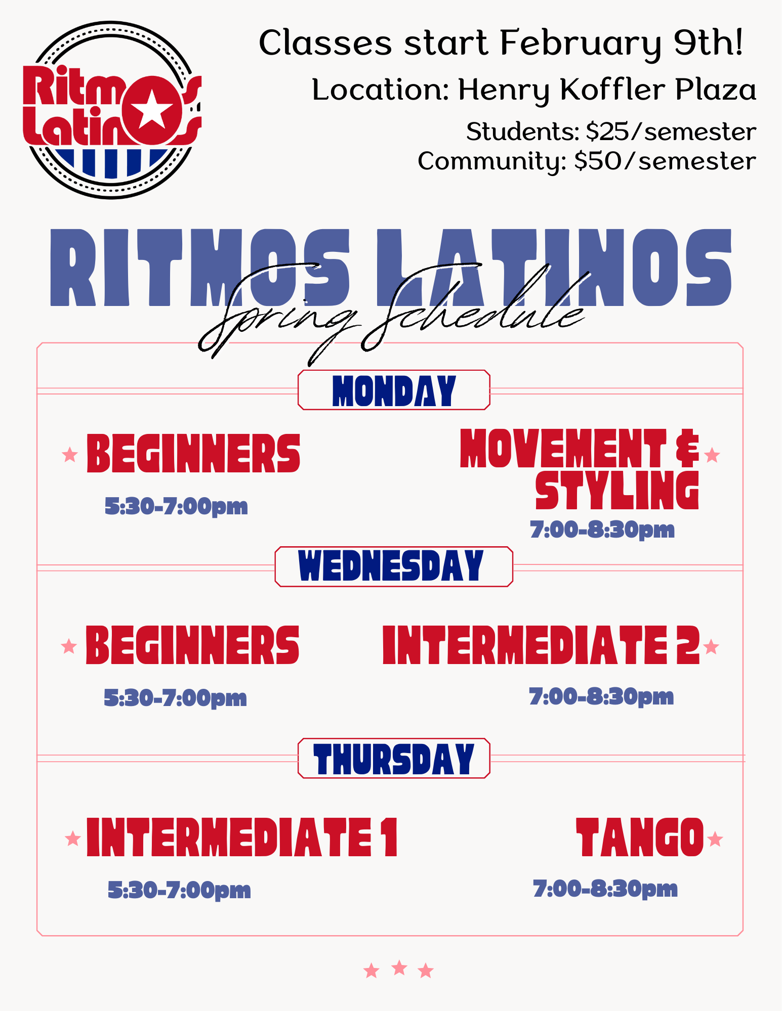 Classes will start on February, 9th with each class meeting their weekly times (specified below). Class locations will be at the Henry Koffler Plaza